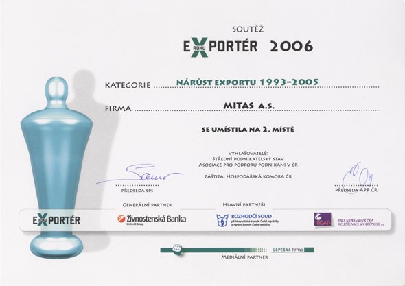 Společnost MITAS dosáhla historicky nejlepšího výsledku, když se ve dvou vyhlašovaných kategoriích umístila na stupních vítězů – v kategorii NÁRŮST EXPORTU 1993-2005 obsadila 2. místo hned za SIEMENS GROUP Česká republika, v kategorii NÁRŮST EXPORTU 2004-2005 byla hodnocena na místě třetím, za firmami STROM telecom, a.s. a ANDREW Telecommunications s.r.o.