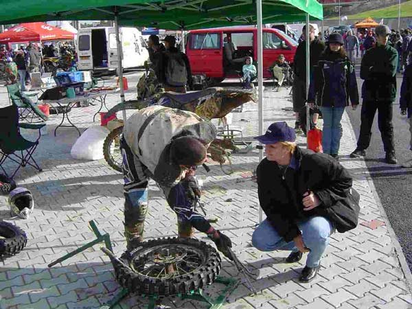 Sean Clark aus Neuseeland ändert seine Reifen vor dem Schlußmotocross unter der Assistenz von Jaroslava Šebíková – Betriebsleiterin von MOTO, MITAS a.s., Produktionsabteilung Zlín.