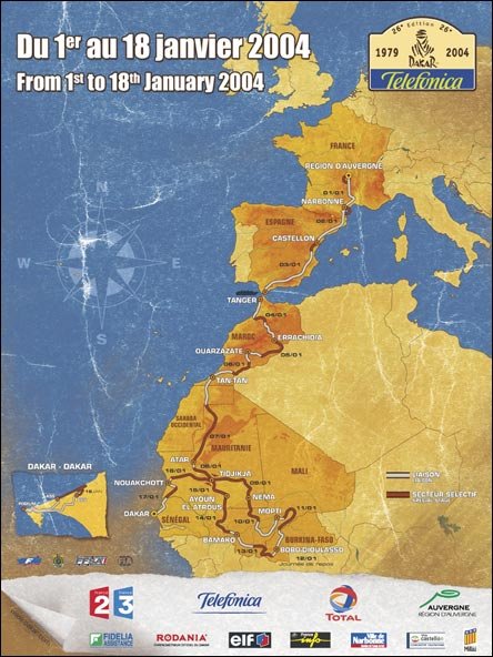 Letošní 26 ročník Rallye Telefónica Dakar 2004 startoval 1. 1. 2004 u Paříže a celkem 17 etap vedlo Francií, Španělskem, Marokem, Mali, Mauretánií, Burkinou Faso a Senegalem.