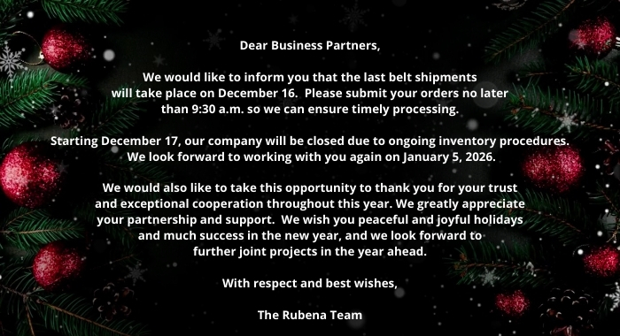 Rubena is a traditional Czech manufacturer of V-belts with a long history. We maintain reliable quality and reasonable prices. We are still working on mutual trust with our customers, deliveries are directed both to the domestic market and abroad. Rubena belts, with their wide range and various material designs, can be used in modern industrial machinery, agricultural equipment and various other applications of today's fast-paced world.