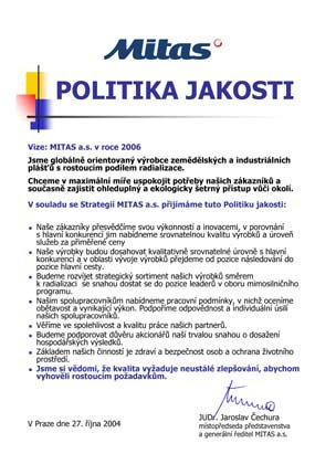 V prvním pololetí roku 2005 čeká MITAS rozšíření certifikátu ISO 14001 o Business Unit Agro Otrokovice.