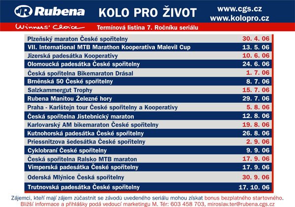 Závodů cílených do všech věkových skupin amatérských a rekreačních cyklistů se pravidelně účastní stovky jezdců a tisíce spokojených diváků. Šestiměsíční maraton 18 víkendových závodů odstartovala v krásném prostředí Brno – Medlánky „Brněnská padesátka České spořitelny“. Pěkné počasí přilákalo na start 850 cyklistů a téměř 2000 návštěvníků. Stejně jako loni je také letos RUBENA významným partnerem celého seriálu.