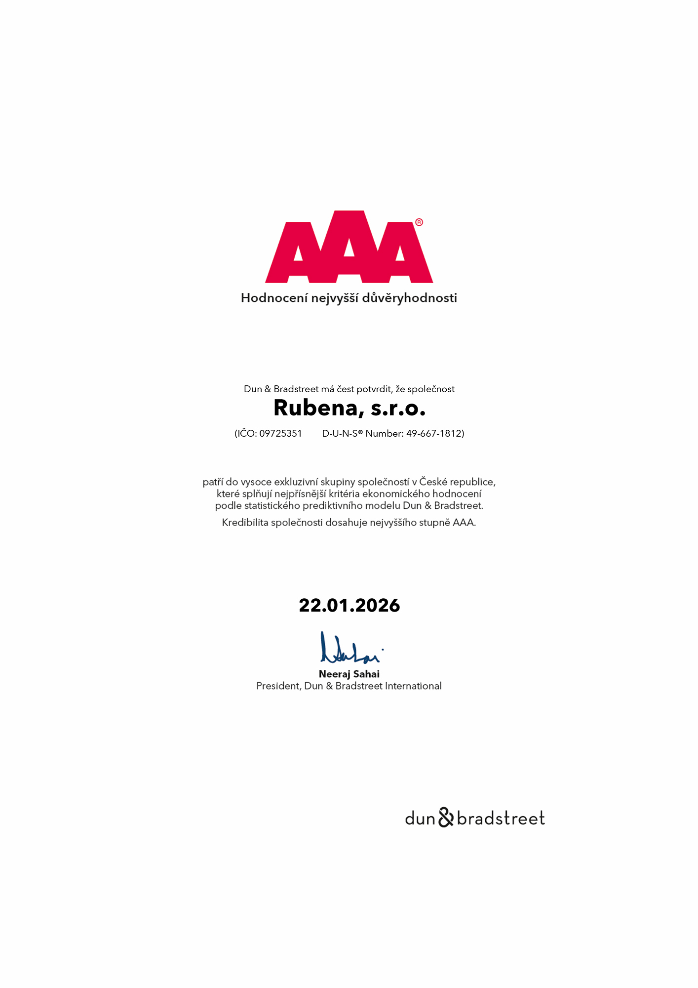 Společnost Rubena získala prestižní certifikát Hodnocení nejvyšší důvěryhodnosti AAA, který uděluje mezinárodní analytická společnost Dun & Bradstreet. Toto ocenění potvrzuje dlouhodobou finanční stabilitu, spolehlivost a vysokou úroveň důvěryhodnosti firmy.