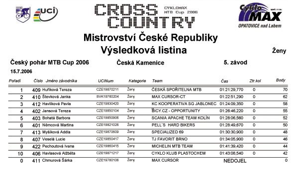 Tereza Huříková se na pláštích RUBENA stala mistryní republiky pro rok 2006 v závodě horských kol, který se konal 15.7. na dnes již klasické trati v České Kamenici.