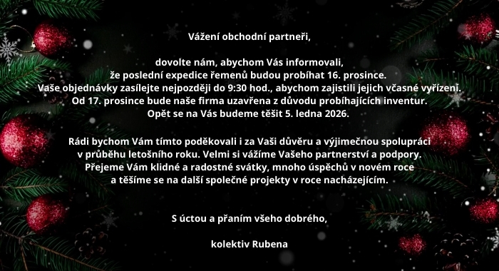 Společnost Rubena je tradičním českým výrobcem klínových řemenů s dlouhou historií. Držíme si spolehlivou kvalitu a rozumné ceny. Stále pracujeme na vzájemné důvěře s našimi zákazníky, dodávky směřují jak na domácí trh, tak do zahraničí. Řemeny Rubena, se svým širokým sortimentem a různým materiálovým provedením, lze použít v moderních průmyslových strojích, zemědělských zařízeních a různých jiných aplikacích současného rychle se rozvíjejícího světa.