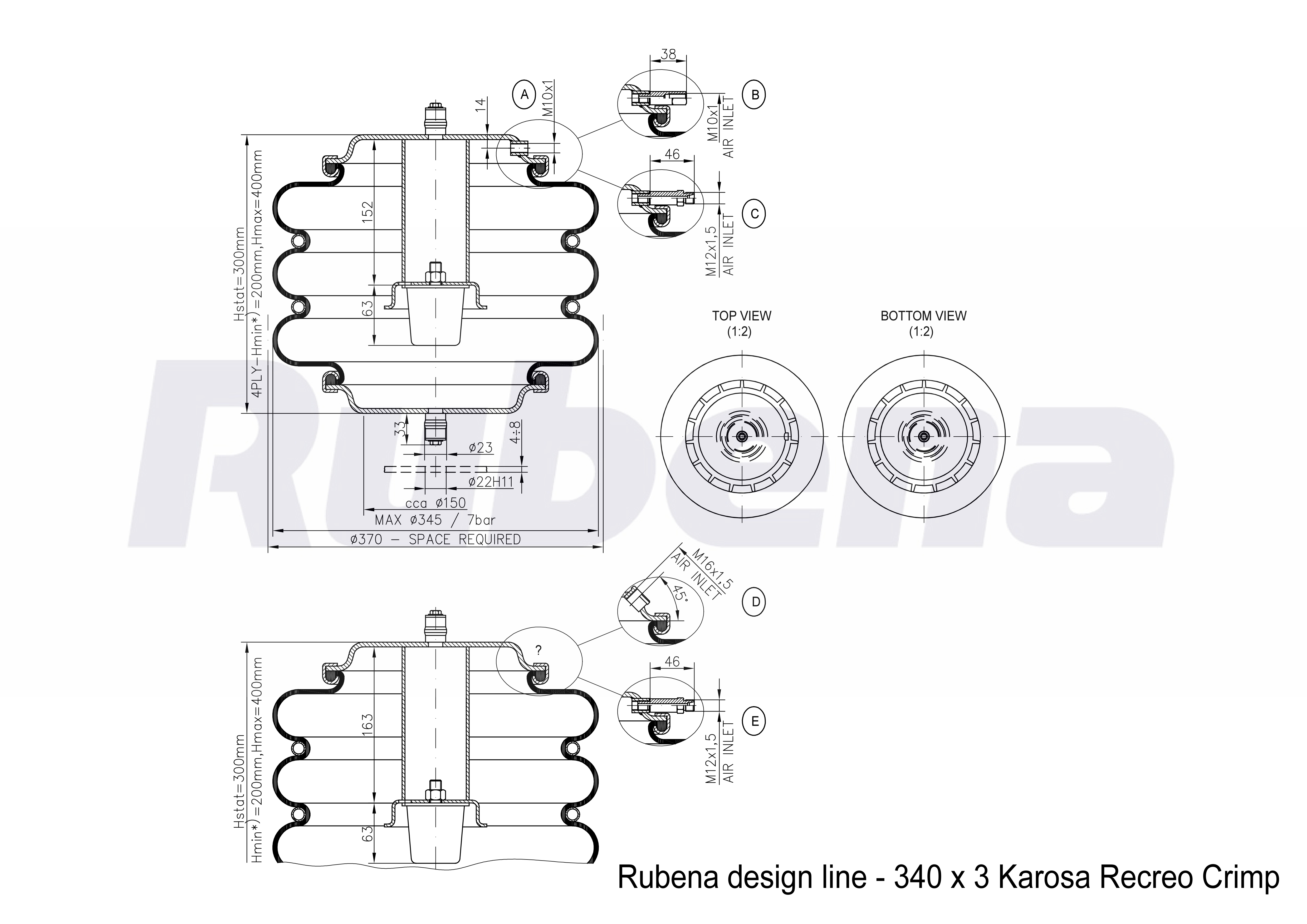 Suspension of axles in Karosa Renault and Karosa Iris buses. *) Given Hmin figure is only theoretical - this height is, in lower parts of the lift, influenced by the stop. Assembly is struck onto the pins on the lids. – pipe height under the stop 152 mm, air inlet with an M10x1inner thread. – pipe height under the stop 152 mm, extended air inlet with an M10x1inner thread. – pipe height under the stop 152 mm, extended air inlet with an M12x1.5 outer thread. – pipe height under the stop 163mm, 45° angle air inlet, with an M16x1.5 inner thread. – pipe height under the stop 163 mm, extended air inlet with an M12x1.5 outer thread.