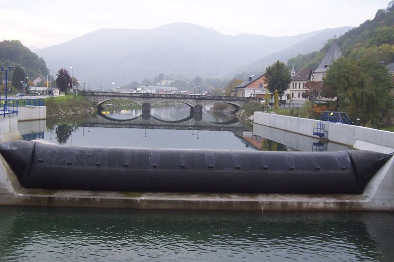 An inflatable weir is a pernament structure consisting of a rubber-textile membrane (the body of the inflatable dam) fixed to a concrete bed using steel anchors and anchoring bolts. The inflatable weir is connected via a system of pipes to a control shaft that provides fully automatic operation of the dam structure via an electronic device.