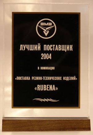 Рубене присудили на 45-ой конференции по качеству, которая состоялась 7. – 8. 4. 2005 в г. Заволжие, премию по поставкам техничской резины, именно следующих груп изделий: прокладных резиновых кольцов для валов и клиновидных ремней, оценку самый лучший поставщик 2004 г. для фирмы Заволжский моторный завод.